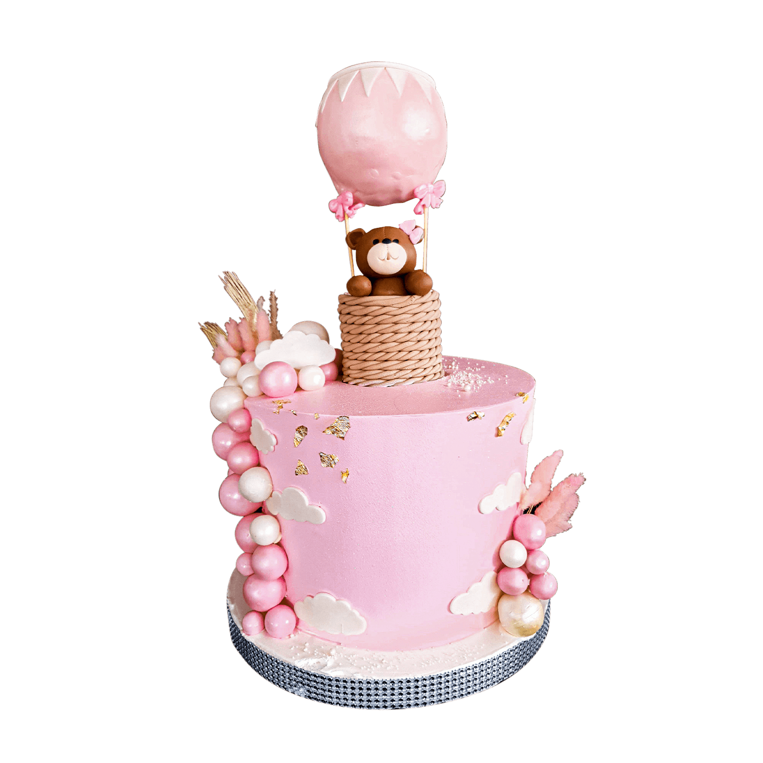 Torta fantasía en masa elástica, chocolatería, keke de vainilla frutada con pasas y pecanas, relleno de manjar ar