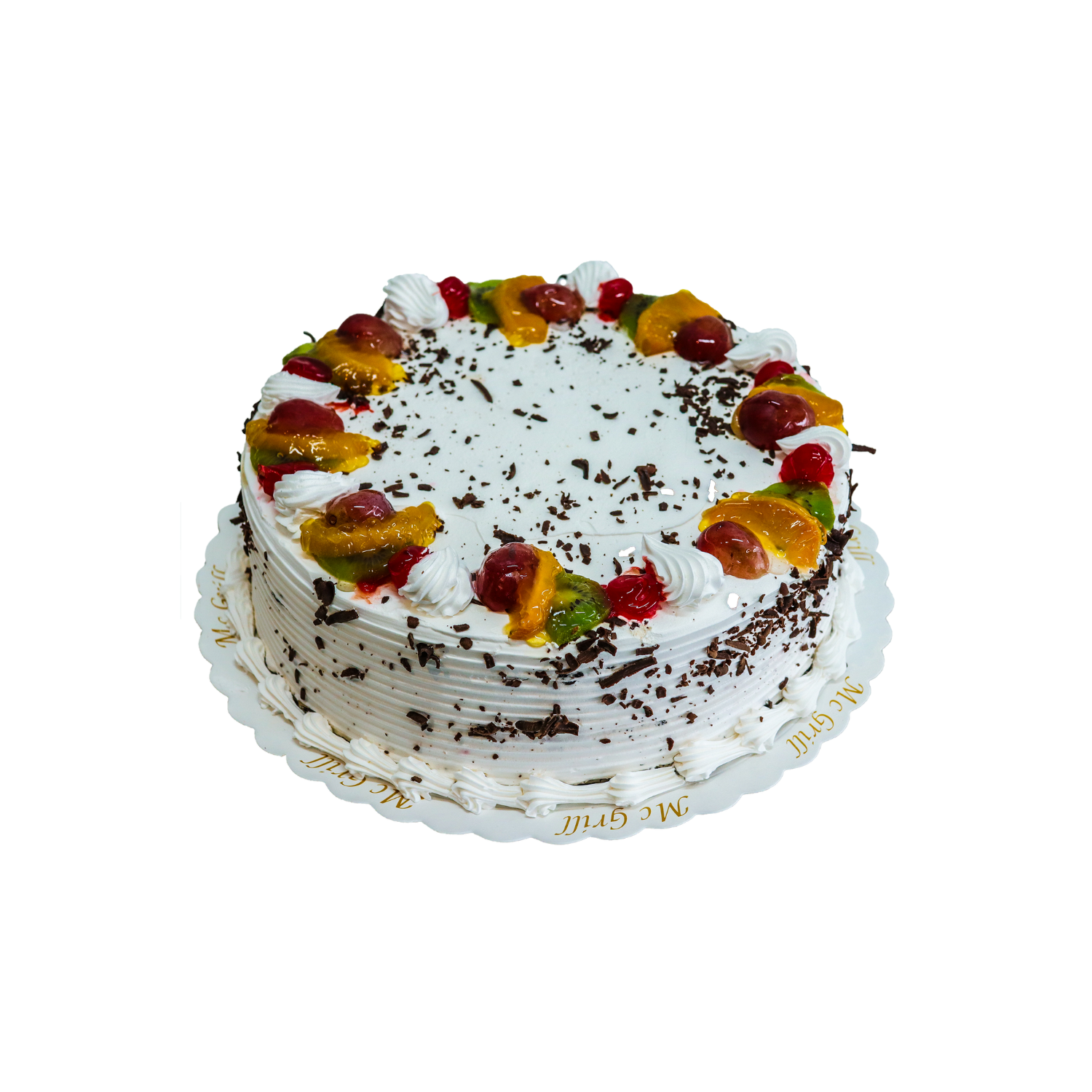 Keke de chocolate relleno de fudge y mermelada, cubierta de chantilly y frutas